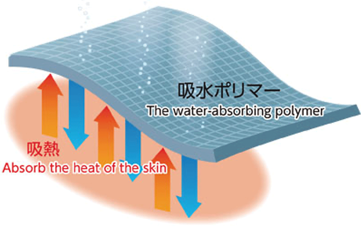 たっぷり水分を含んだ吸水ポリマーが肌の熱を吸熱し、水分が蒸発する際の気化熱で冷感を得られます。 熱中症対策にぜひどうぞ。